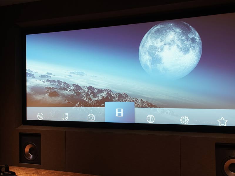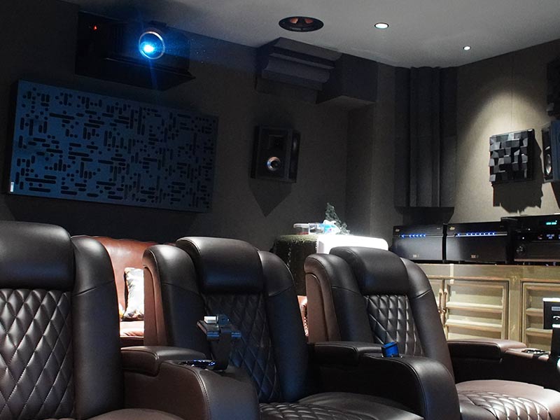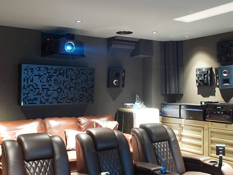 在對(duì)于視頻部分結(jié)合前墻寬度以及沙發(fā)觀影距離的觀影舒適度,設(shè)計(jì)之初考慮了2.35:1的寬熒幕,這也是好萊塢電影的拍攝比列標(biāo)準(zhǔn),同樣為了消除環(huán)境的光污染,四個(gè)墻面做的都是深顏色的透聲布修飾尤其是吸頂?shù)膿P(yáng)聲器都按照磨砂黑定制,投影選擇了jvs的的n98,經(jīng)過(guò)isf專(zhuān)業(yè)視頻調(diào)后,黑位深沉,亮部飽滿(mǎn)色彩準(zhǔn)確