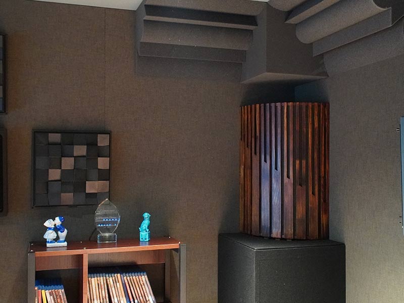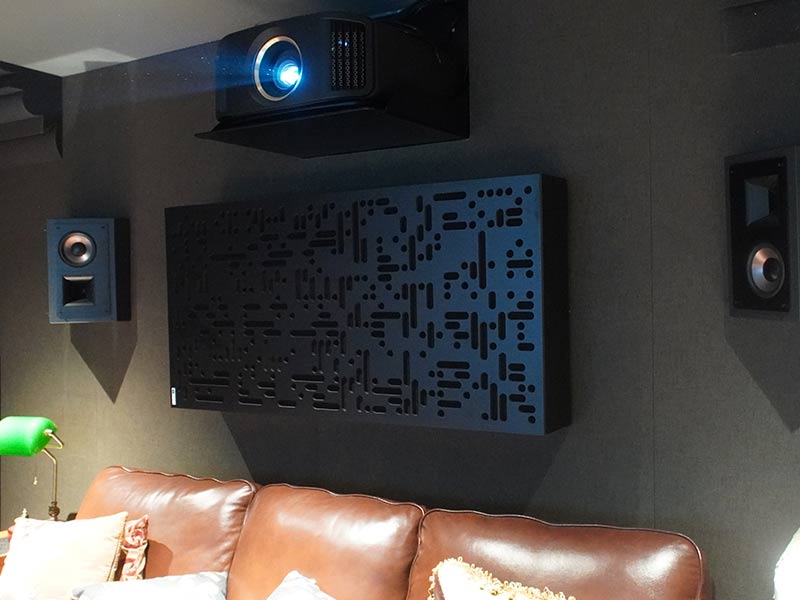 既然要做到影院級(jí)的視聽(tīng)效果,除了影音設(shè)備外,視聽(tīng)的聲學(xué)處理也是必不可少的。在不影響整體造型美觀度的前提下,比較不一樣的在于后墻的處理,設(shè)計(jì)初衷將整面后墻主要擴(kuò)散區(qū)域用3D立體擴(kuò)散體布置,在配套燈光的映襯下,保證良好聲學(xué)特性的原則之外,又能兼顧良好的觀感,何樂(lè)不為呢?(3D擴(kuò)散體能通過(guò)它的立體表面對(duì)音波進(jìn)行不同角度的傳導(dǎo),消除音波在擴(kuò)散過(guò)程中的盲區(qū),改善音質(zhì),平衡頻響,優(yōu)化聲場(chǎng),營(yíng)造高密度的環(huán)繞包圍感;比較多用于做球形擴(kuò)散,布置在環(huán)繞揚(yáng)聲器區(qū)域)。