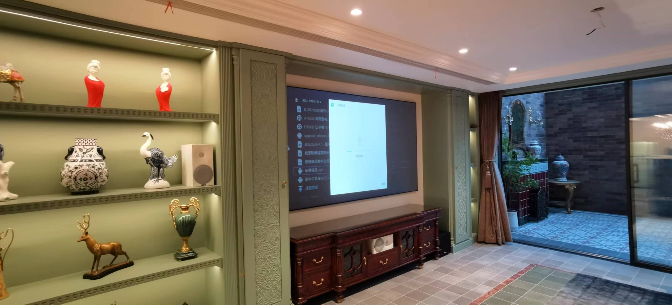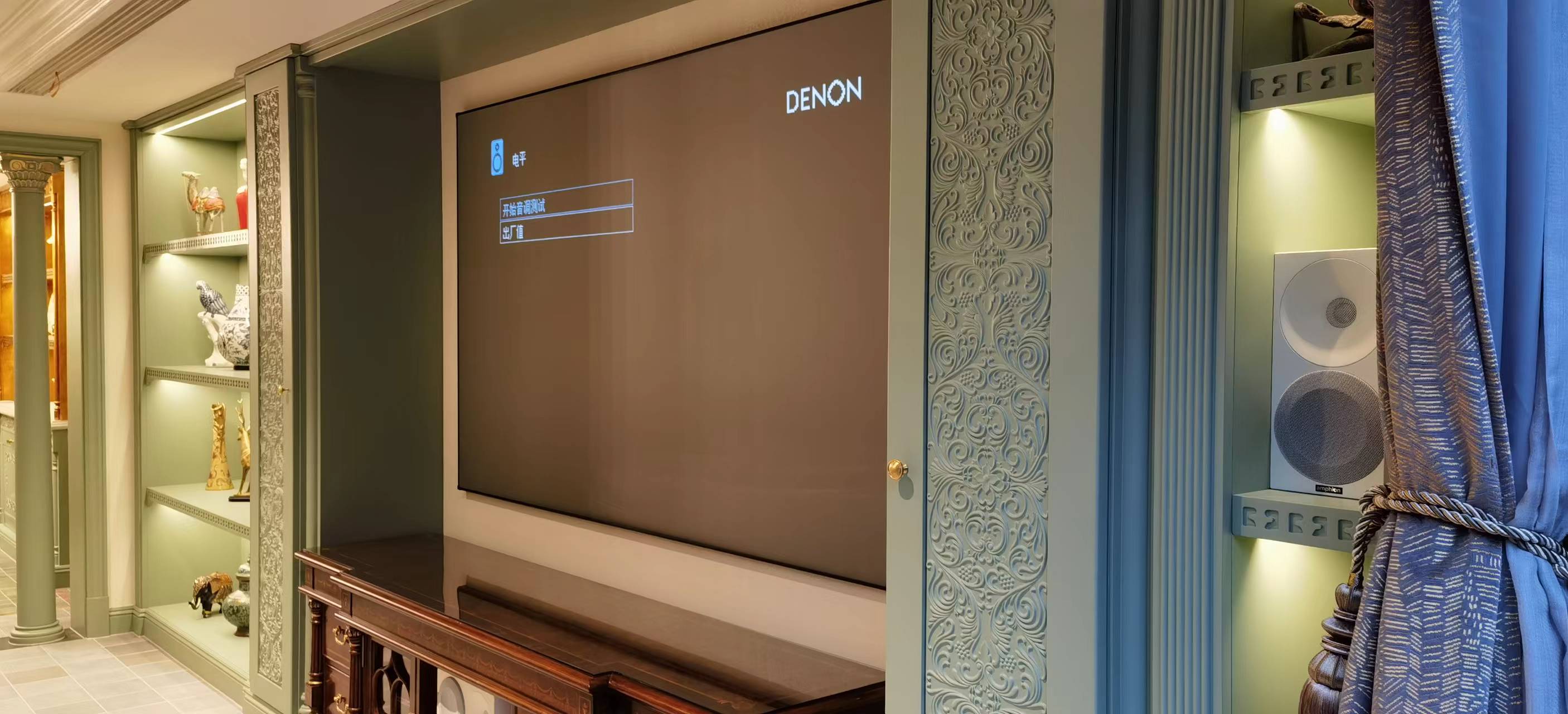 前墻是一個(gè)5*2.5米的空間,考慮到黃金分割,同時(shí)綜合觀影距離兩方面,我們選用了120寸大小的幕布,由于是開放式空間有白天和微光觀影的需求,幕布不約而同的選用了億立的抗光幕布,這塊幕布不僅能提升黑位和抗光,灰色的抗光涂層和空間相映襯。