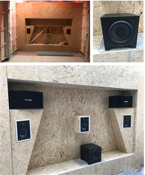 功能上考慮影院與卡拉OK,為了滿足整體效果與簡潔性,前墻做了50公分聲學(xué)墻設(shè)計(jì),內(nèi)側(cè)四周實(shí)填充吸音棉,在滿足前墻強(qiáng)吸音的基礎(chǔ)上,也是一道強(qiáng)有力的低頻陷阱,同時(shí)為了揚(yáng)聲器的指向性更集中,結(jié)構(gòu)造型上左右主聲道也做了一定傾斜設(shè)計(jì)。