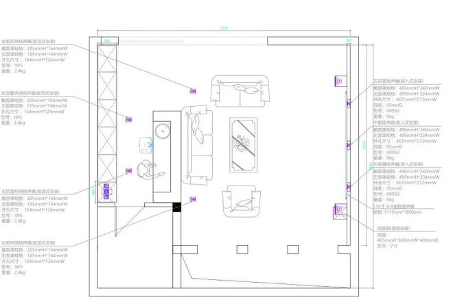 兩套系統(tǒng),設(shè)備較多,設(shè)計師出具設(shè)備定位紙,按照測量所得,實施提前布線及開孔。我們?yōu)榱撕啙嵭郧叭粝渑渲玫腗&K SOUND IW950嵌入式設(shè)計,環(huán)繞采用的是M&K SOUND IW85吸頂式設(shè)計,卡拉ok外掛,不占用空間。