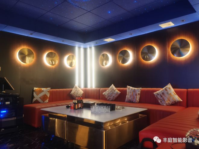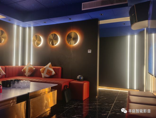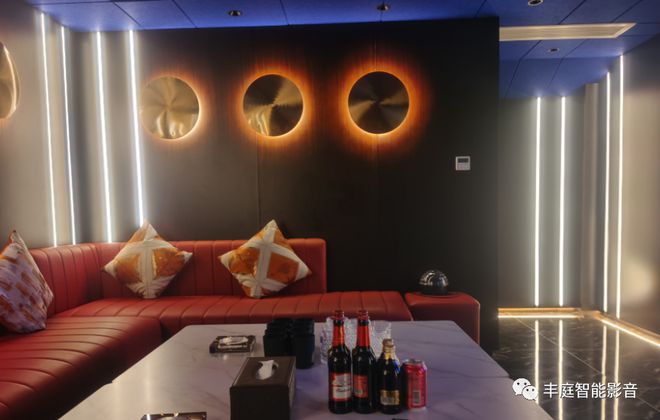 除此之外,唱歌輕松,能在歡樂的環(huán)境中洽談生意也是建立此KTV招待室的目的。為了讓整個空間效果更佳,頂面我們采用了星空頂的設計,墻面采用木質裝飾板加燈條與裝飾燈的設計,地面用大理石的設計,配合U形的沙發(fā)搭配金屬大理石臺面的茶幾,使整個空間的的混響時間控制在0.5-1秒,也滿足了客戶商務KTV的風范。