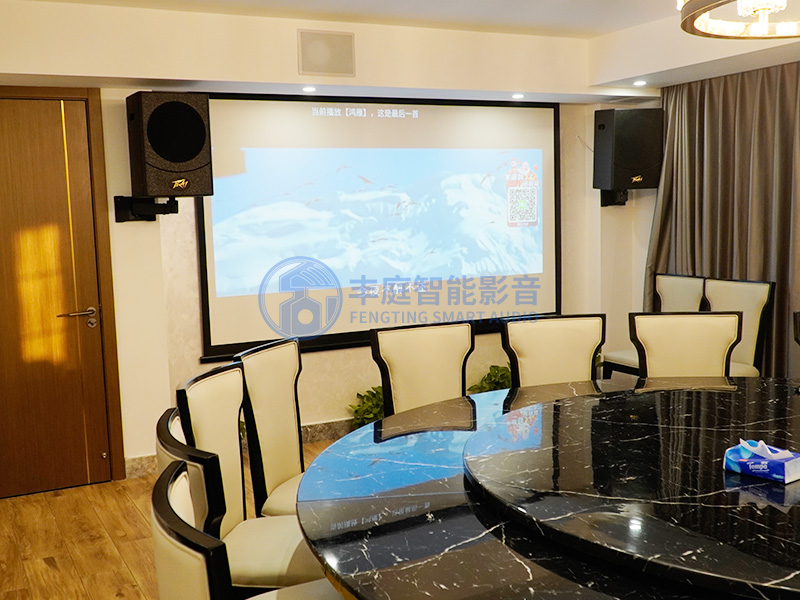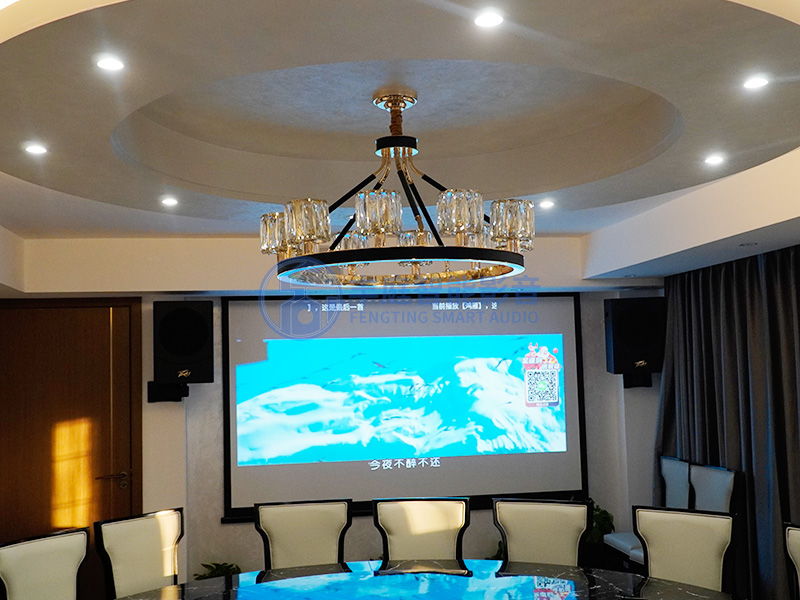 因這個空間平常還要接待朋友吃飯,這個房間內(nèi)要考慮到擺放一個大的餐桌,所以不需要沙發(fā)之內(nèi)的家具,整體看上去就是一個餐飲的包房,大家可以一邊喝酒一邊娛樂,看到客戶能夠把酒言歡的同時,對于我們這套系統(tǒng)的稱贊連連。
