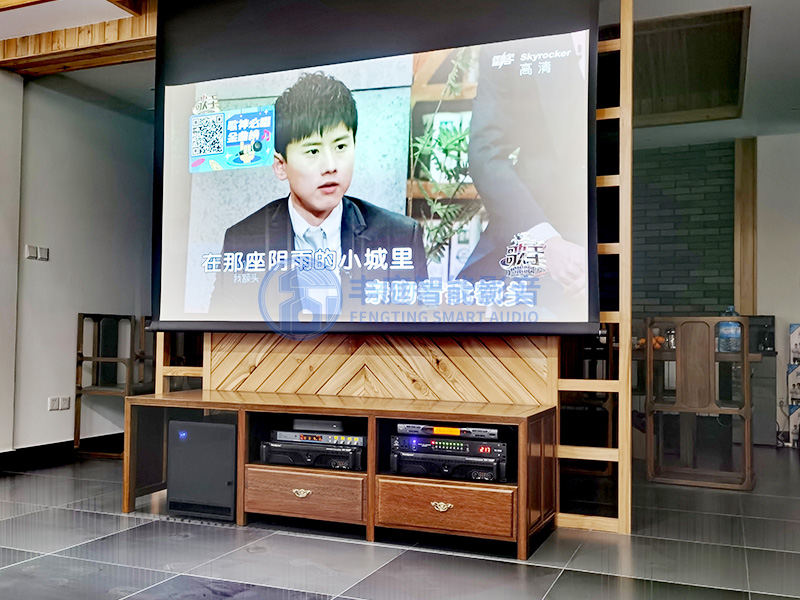 視頻部分我們采用的是Optoma超短焦的高清投影機,卡拉ok的歌曲MV畫質(zhì)基本上都是高清的畫質(zhì),所以不考慮4k畫質(zhì)提高成本,設(shè)計師發(fā)現(xiàn)房間內(nèi)的光照度比較高,所以幕布采用的是110寸高增益的電動幕布,彌補投影亮度的損失。就算白天也能顯示的很不錯