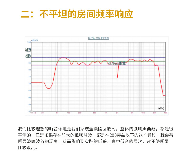 我們比較理想的聽(tīng)音環(huán)境是我們系統(tǒng)全頻段回放時(shí),整體的頻響聲曲線,都是很平滑的,但是如果存在較大的低頻駐波,都是在200赫茲以下的這個(gè)頻段,就會(huì)有明顯波峰波谷的現(xiàn)象,從而影響到實(shí)際的聽(tīng)感,高中低音的層次,就不夠明顯,比較混亂。