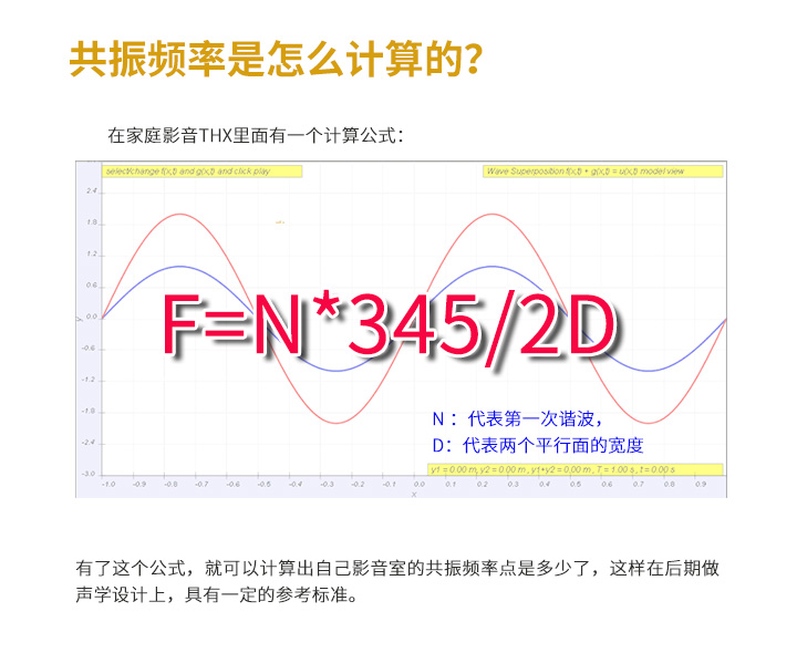 有了這個(gè)公式,就可以計(jì)算出自己影音室的共振頻率點(diǎn)是多少了,這樣在后期做聲學(xué)設(shè)計(jì)上,具有一定的參考標(biāo)準(zhǔn)。