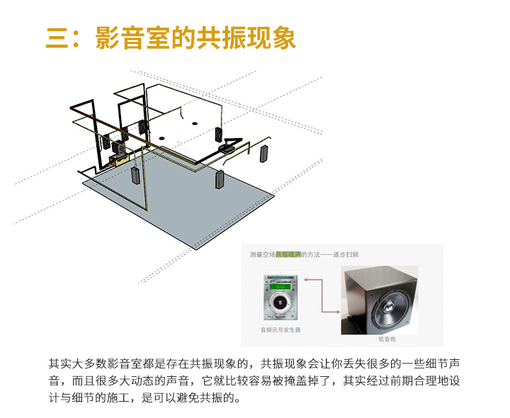 其實(shí)大多數(shù)影音室都是存在共振現(xiàn)象的,共振現(xiàn)象會(huì)讓你丟失很多的一些細(xì)節(jié)聲音,而且很多大動(dòng)態(tài)的聲音,它就比較容易被掩蓋掉了,其實(shí)經(jīng)過(guò)前期合理地設(shè)計(jì)與細(xì)節(jié)的施工,是可以避免共振的。