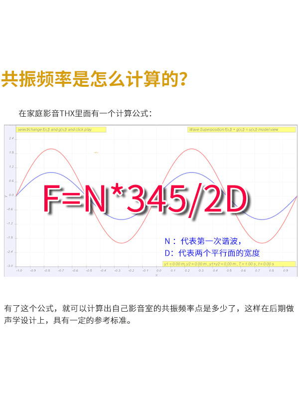 有了這個(gè)公式,就可以計(jì)算出自己影音室的共振頻率點(diǎn)是多少了,這樣在后期做聲學(xué)設(shè)計(jì)上,具有一定的參考標(biāo)準(zhǔn)。